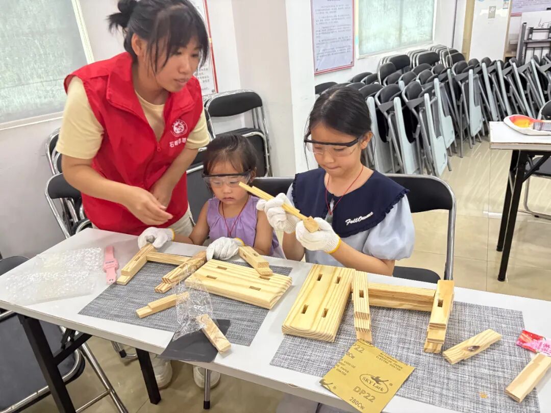 手工制作,传递环保理念 依托社区党群服务中心,本次夏令营开展了植物拓染、手工剪纸、羊毛毡戳戳乐、冰箱贴DIY、传统木工榫卯板凳制作等一系列活动,将手工制作与“变废为宝”的环保理念深度融合,引导小营员们发挥奇思妙想,利用落叶、花朵、废弃布料等素材,让闲置旧物在“旧物新生” 中焕发新颜,推动青少年儿童在巧手创作中感受亲身制作的独特乐趣,度过充实而有趣的假期。
